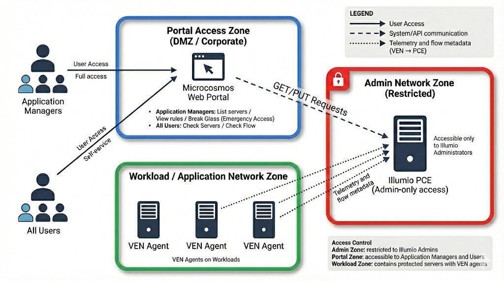 Microcosmos is in the corporate/DMZ zone. It queries the Illumio PCE (admin zone) and shows telemetry from VEN-protected workloads.