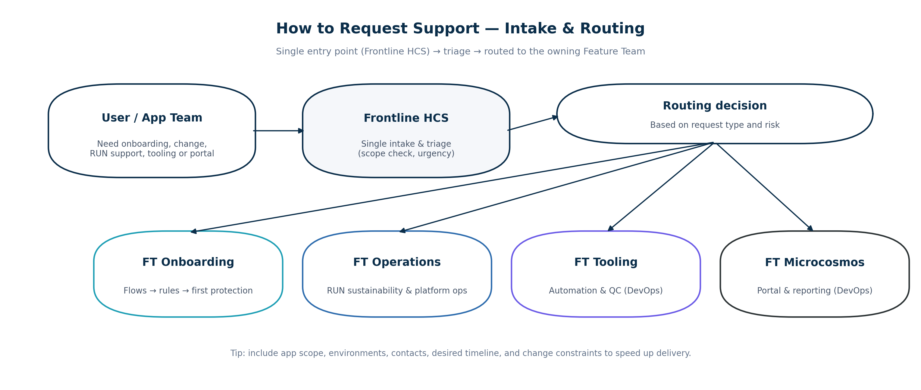 All requests go through a single intake channel (Frontline HCS) to ensure: - Fast triage and routing to the owning Feature Team - Proper scoping and prioritization - Consistent tracking and auditability