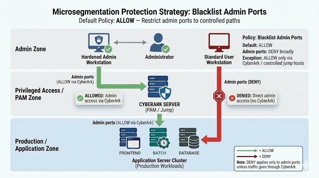 - Admin ports are ALLOWED only via controlled jump hosts / admin zones (example: CyberArk / PAM)