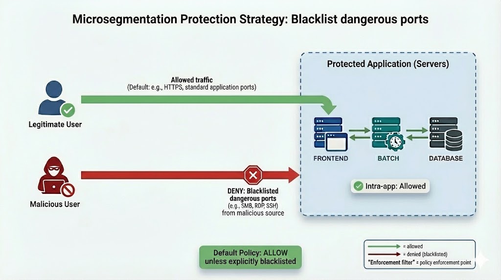 This strategy denies a set of high-risk ports often used for discovery, legacy services, or lateral movement.