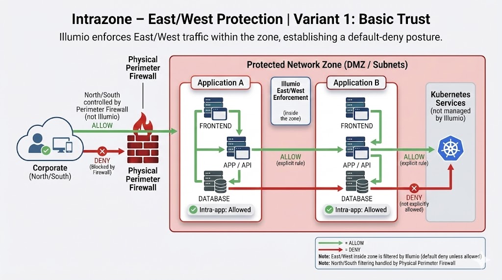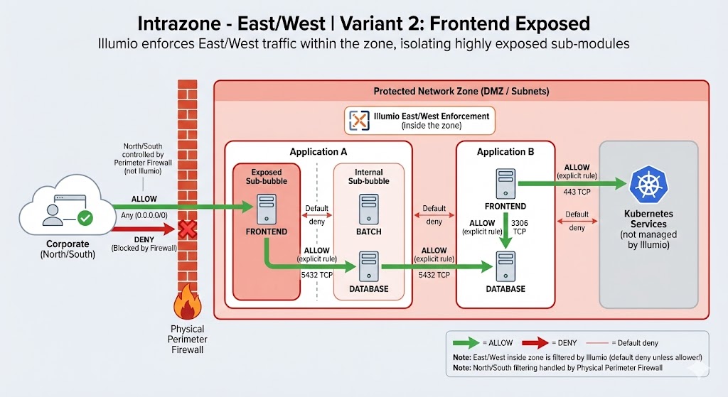 - The zone may host unmanaged elements (e.g., Kubernetes services) while traffic to/from them remains policy-controlled by Illumio